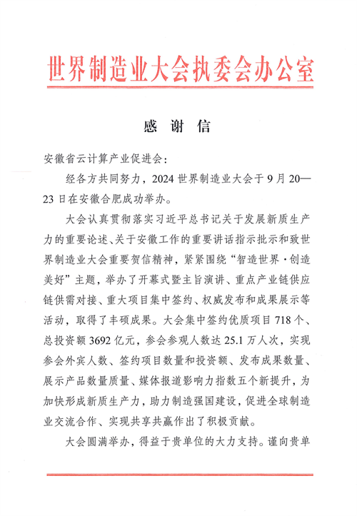 近日,云促会收到世界制造业大会执委会办公室发来的感谢信,对我会为2024世界制造业大会圆满举办所作的支持与贡献表示感谢。在2024世界制造业大会中,云促会联合承办2024世界制造业大会工业人工智能与四新经济星烁场景专场发布会,并组织会员单位参会,搭建广阔的交流学习平台,促进云计算产业链上下游协同创新,为推动制造业数字化转型和高质量发展贡献力量。