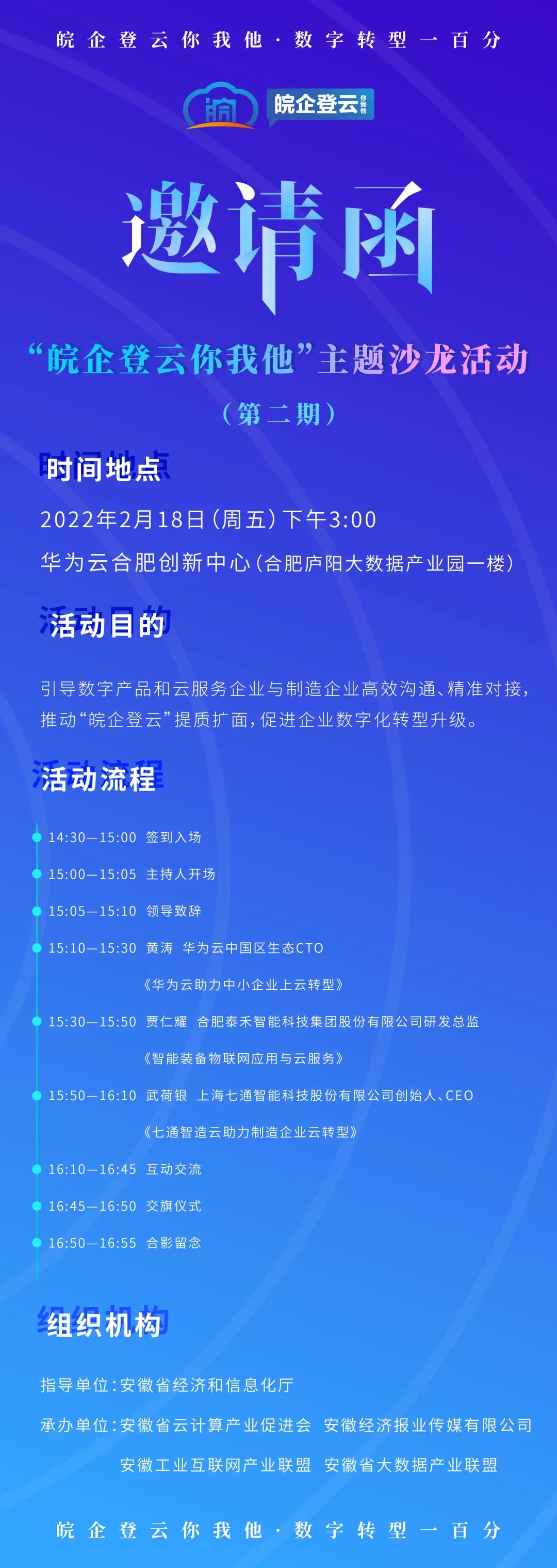 皖企登云你我他、数字转型一百分,该活动由安徽省经信厅指导,安徽省云计算产业促进会、安徽经济报业传媒有限公司、安徽工业互联网产业联盟、安徽省大数据产业联盟多家单位共同承办。作为服务企业上云上平台的活动载体,将坚持每月举办一期,在云资源赋能方和云资源需求方之间搭建一座沟通交流、供需对接的桥梁,助力“皖企登云”提质扩面。