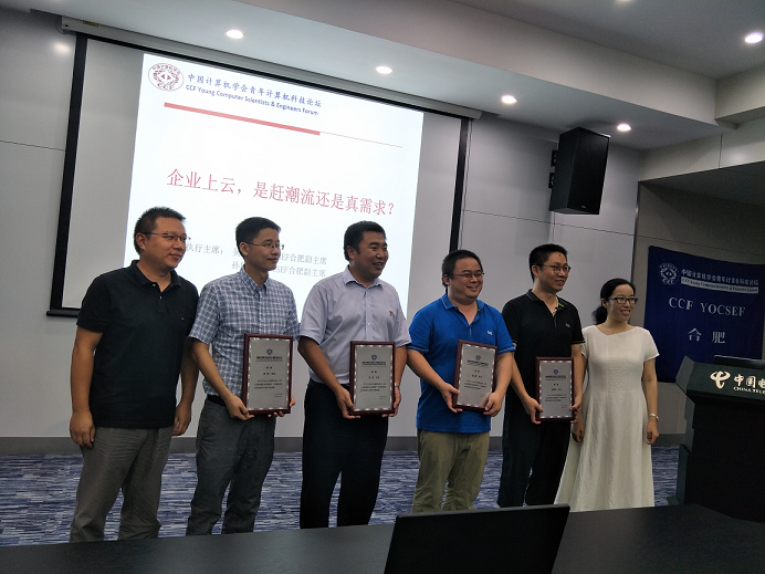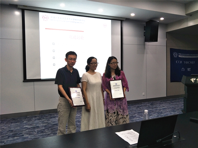 颁奖环节,由安徽省经信委信息化推进处谭处长、CCF YOCSEF 合肥主席赵姝分别向张云泉、彭绍亮、汤进、刘松四位颁发了CCF YOCSEF特邀嘉宾证书。