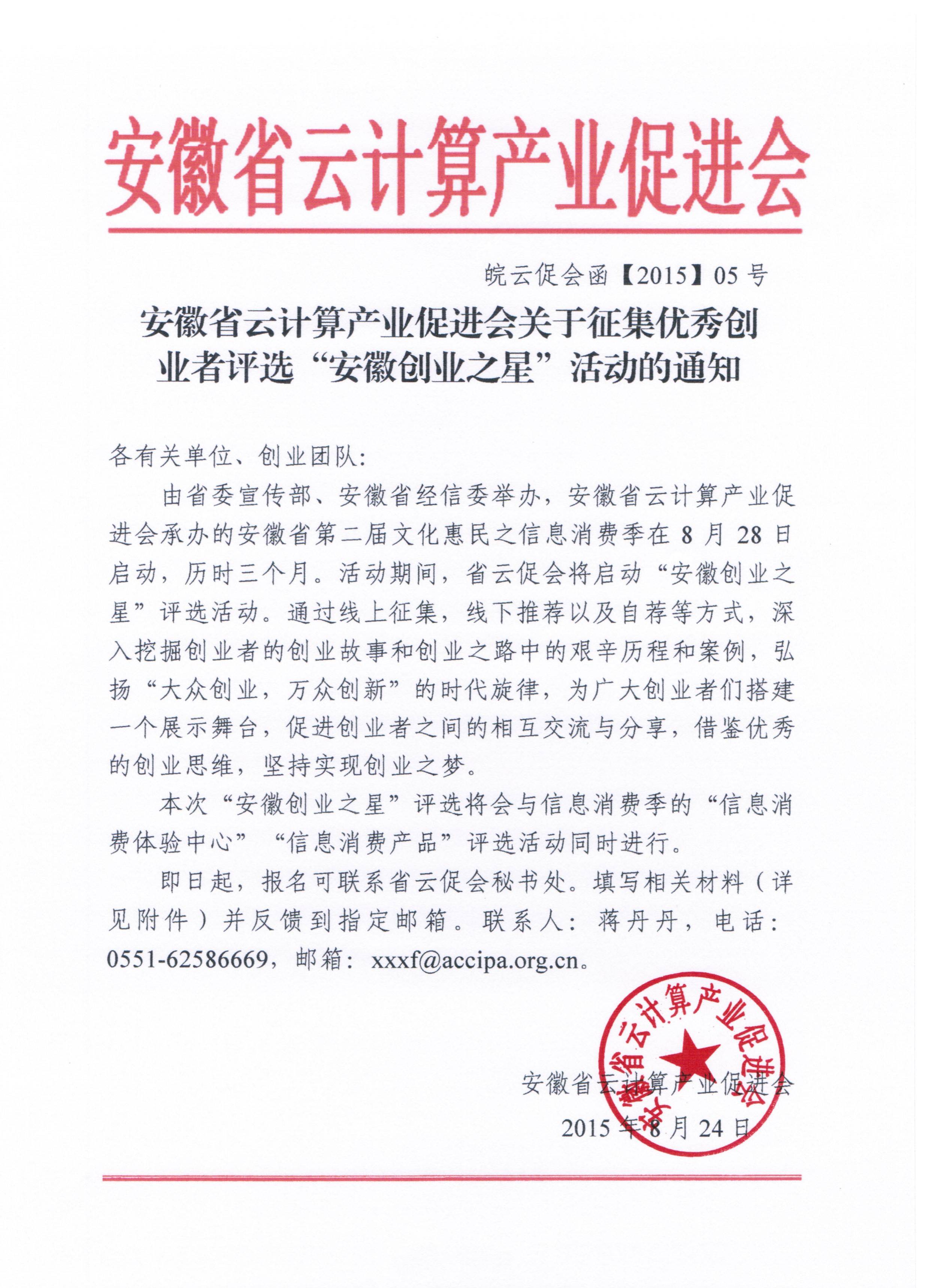 安徽省云计算产业促进会关于征集优秀创业者评选“安徽创业之星”活动的通知